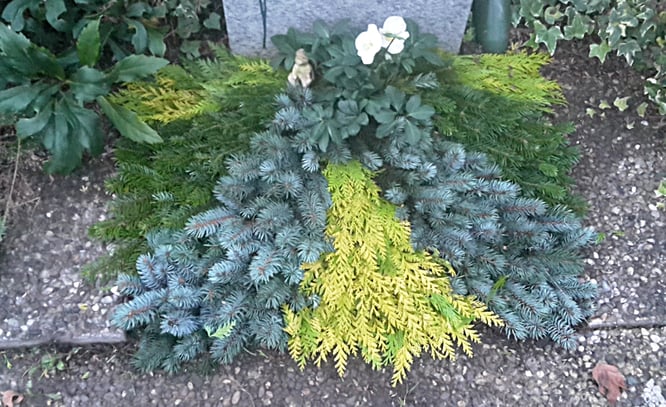 Grab mit Konifeeren abgesteckt und Christrose